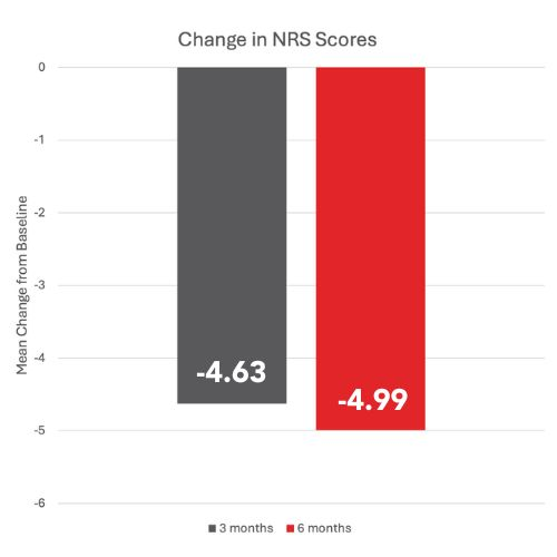 Numerical Rating Scale (NRS) pain scores improved 57% at 3 months and 60% at 6 months