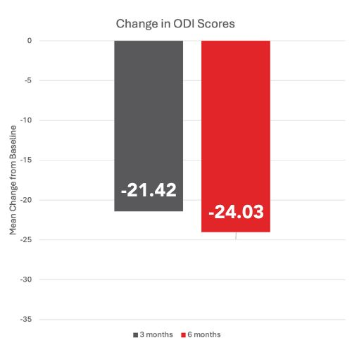 Oswestry Disability Index (ODI) scores improved 44% at 3 months and 49% at 6 months