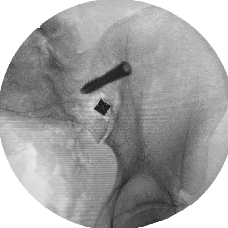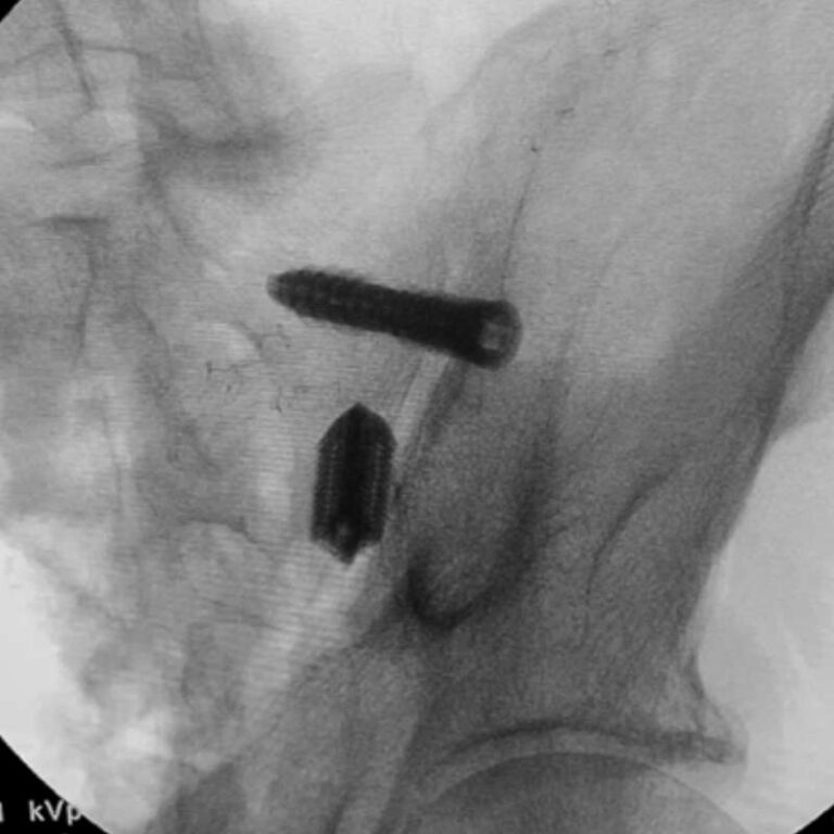 Fluoroscopy confirms implant and screw positioning. The compression threads draw the sacrum and ilium together, stabilizing the construct and promoting fusion.